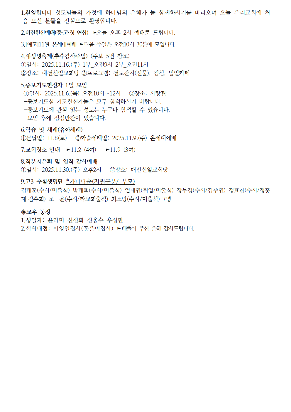 2025년 11월 2일 교회소식